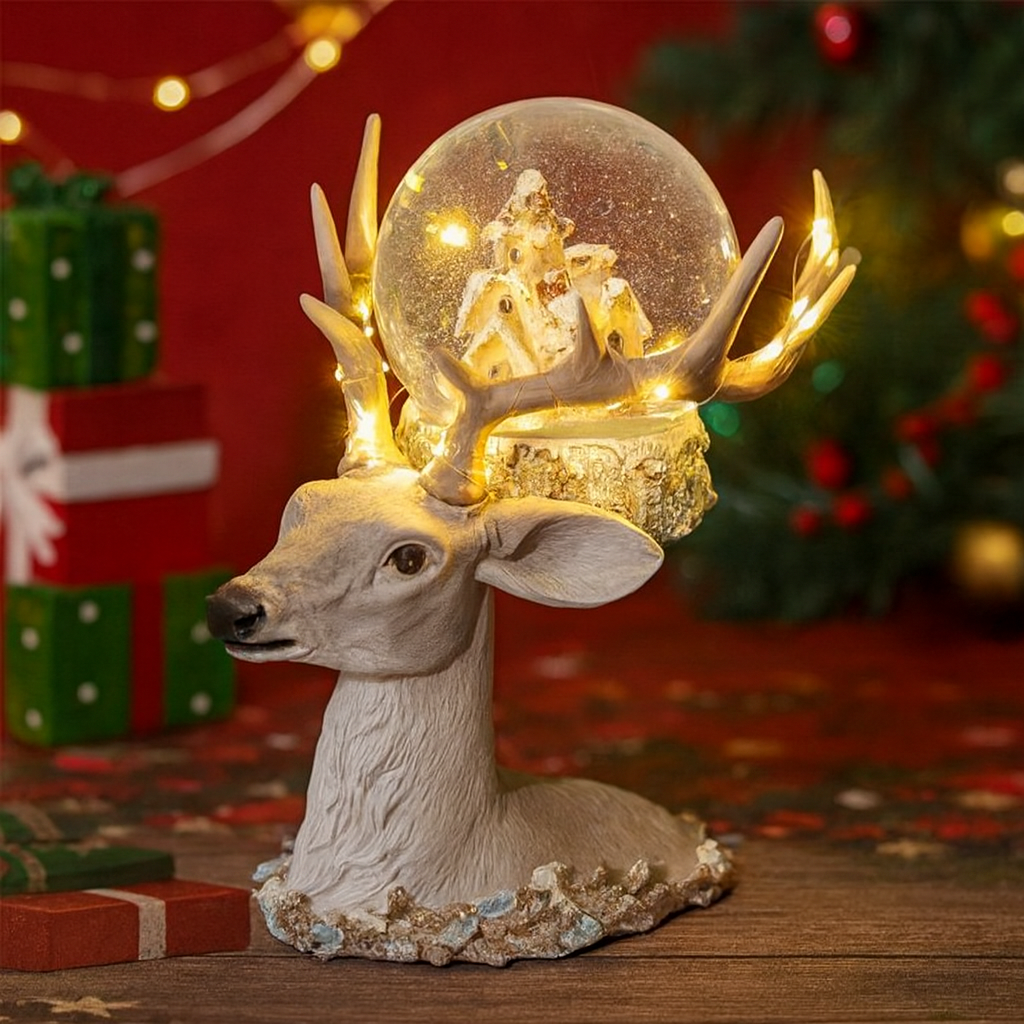 - Дизайн: Реалистичен елен с вплетени светлини и снежна топка с къщичка