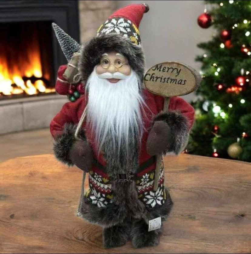 45 см коледна фигура, облечена в класическо червено с пухкави детайли и плетени орнаменти. В ръка държи табелка „Merry Christmas“ и носи чувал с подаръци – готов да внесе уют и празничен дух.