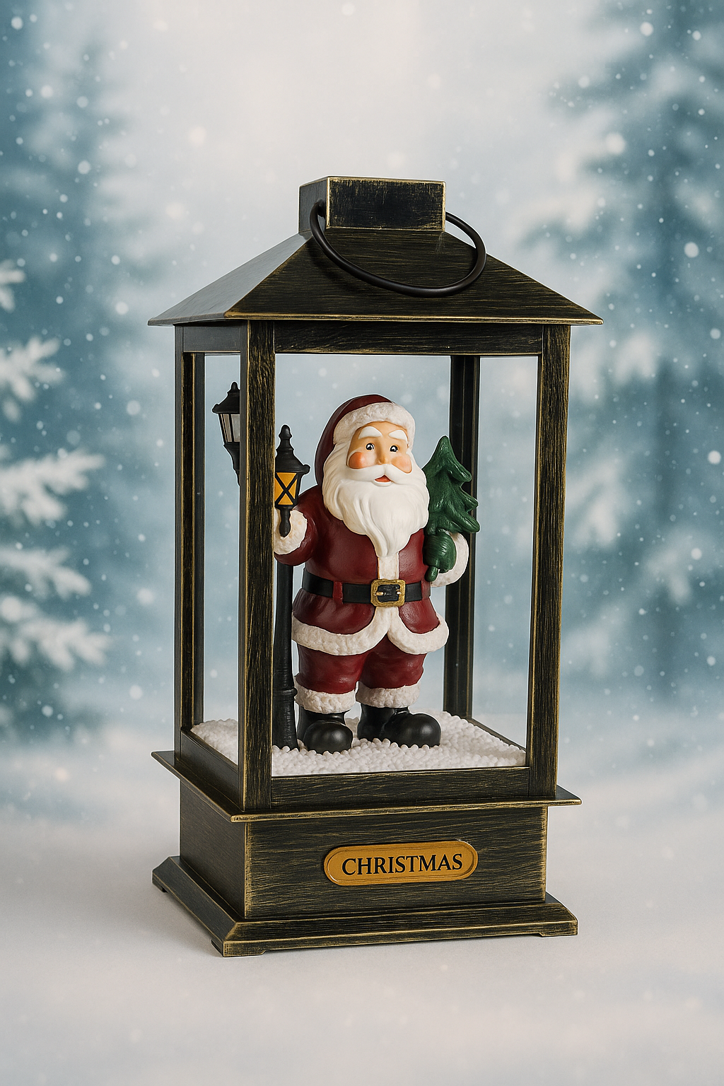 Внесете коледна магия и топлина у дома с тази изящна декоративна фенерна лампа. Вътре е разположена фигура на весел Дядо Коледа, който държи фенерче и елхичка – символ на светлината и надеждата през празничния сезон.