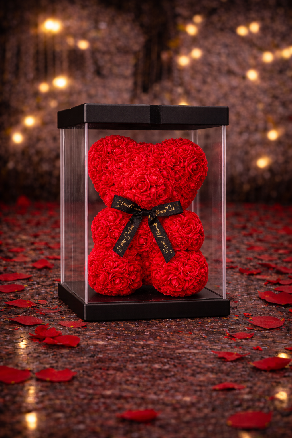 Подарете символ на неувяхваща любов. Това изящно мече, създадено ръчно от стотици меки, вечни рози, е идеалният начин да кажете „Обичам те“ без думи. Пристига директно в луксозна подаръчна кутия, готово да предизвика усмивка и да остане скъп спомен завинаги – без нужда от поливане или грижи.
